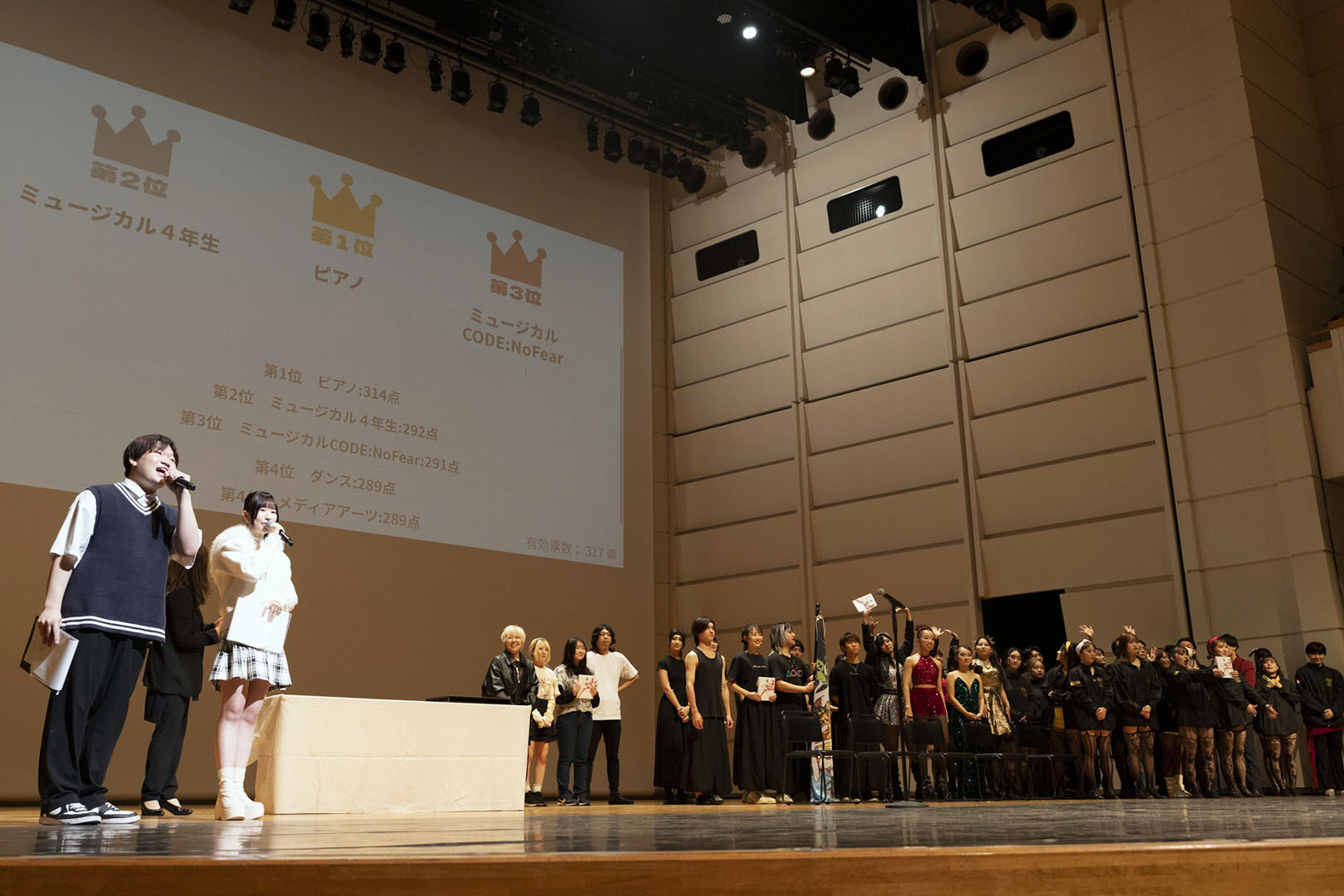観客が1〜3位をその場で投票し、1位票が3点、2位票が2点、3位票が1点として集計されました。